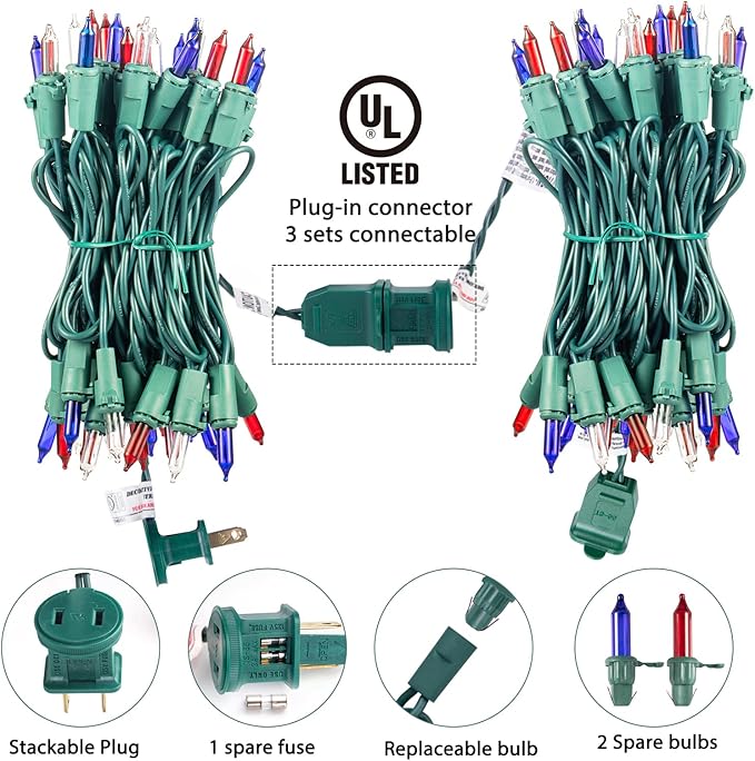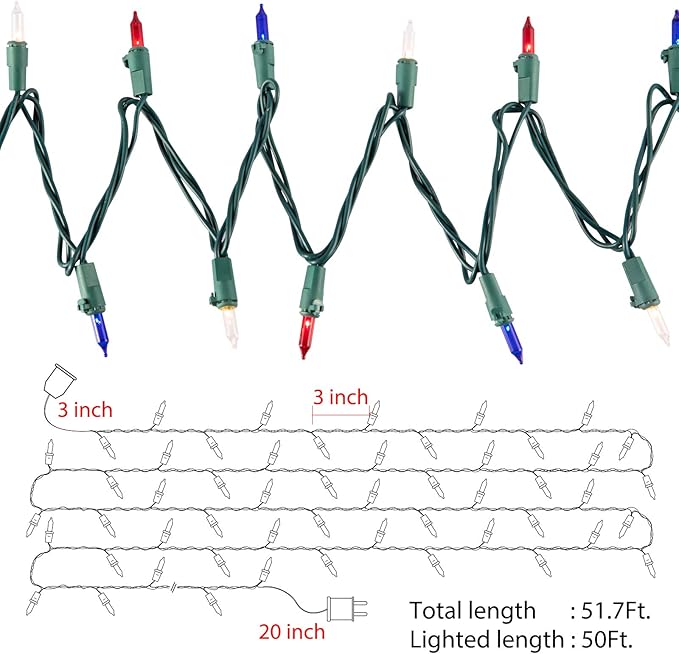 - Creative Patriotic Decorations: This Independence Day Decorations light on green wire set includes 200 incandescent mini bulbs. The total length is 51.7 feet, each bulb is 3 inches apart, 20 inches lead wire, 3 inches end connector. It can be connected end to end to meet your decoration needs, up to 3 creative light strings