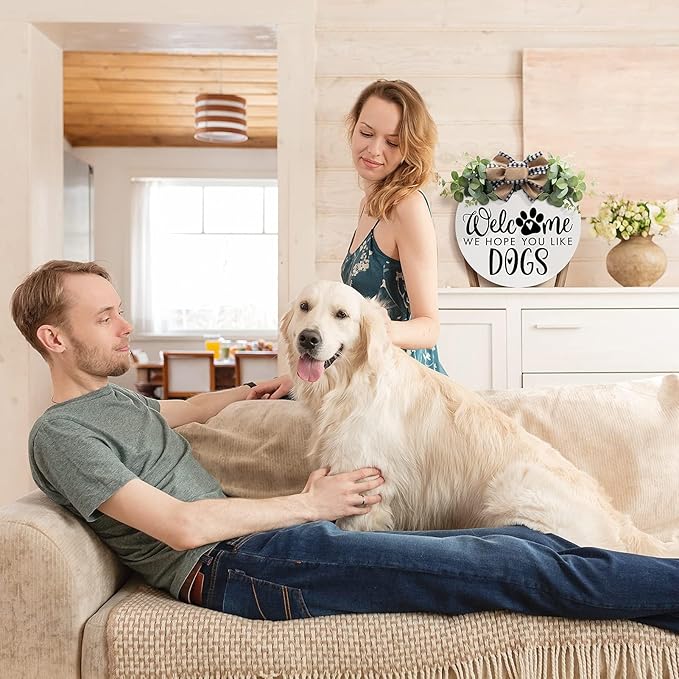 - WARM CUSTOMER SERVICE: Measures 12"L×12"W,please ensure the size of our round welcome dogs door hanger can meet your demands before ordering! With impressive and vivid letter “welcome we hope you like dogs” with paw print to show we're dogs friendly, your welcome sign for door or wall display will be the one everyone in the neighborhood is talking about! Guaranteed to welcome your guests with a giggle! Feel free to send us your issues, risk free to get one