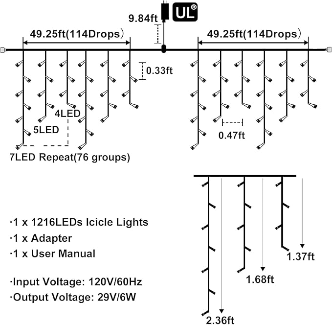- 【99 ft 1216 LED Christmas Lights】There's 228 vertical strands of light that hang from the single 98.5 foot string, the 9.8ft lead wire connected to the plug is in the middle of the twinkle lights. Christmas outdoor lights are long enough to cover the length of porch, eaves, forecourt, room, fence,etc. If you want that high density look, double up the icicle Christmas lights outdoor.