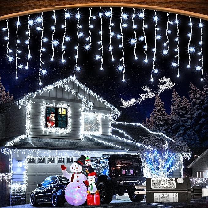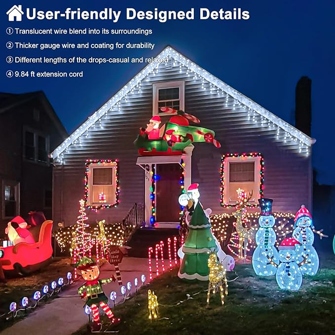 - 【Waterproof Christmas icicle lights】The icicle lights is perfect for outdoor using, including heavy rain and snow. Sealed LED beads, thick gauge wire and coating all are IP44 waterproof, they make the outdoor icicle lights durable and worked great through the season. But please kindly note that the plug is not waterproof, please do some protection or keep them away from water.