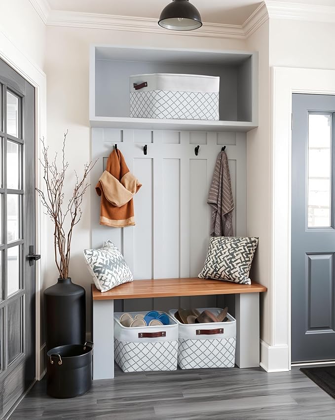 - Premium Bin Material: These storage bins are made with extra thick EVA fabric and are reinforced with a 2.5mm MDF fiberboard bottom, upper metal frame, and faux leather handles to withhold the daily use of bins for years to come.