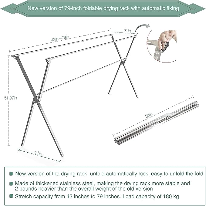 - [ SPACE SAVING ] The clothes drying rack folding indoor can be adjusted according to the size of the space. The length of the horizontal rod is 43-79 inches, and the maximum size is 79"L*21"W*52"H inches. It can hang the more clothes. The clothes rack folded size is only 55"L*5"W*4"H inches,can be placed in any corner.