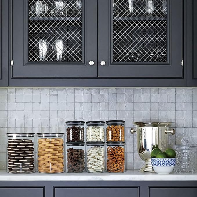 - ✅ 2021 NEW STYLISH BLACK LID: Looking for black and white, cool and stylish home deco? These Urban Green glass food storage canister sets with black lids are perfect for contemporary pantry design. We carefully selected 5 different sizes from 6oz to 100oz that can store any dry food, such as pasta, beans, nuts, cookies, spice or flour. Try our black lids glass jars for a new modern pantry organization.