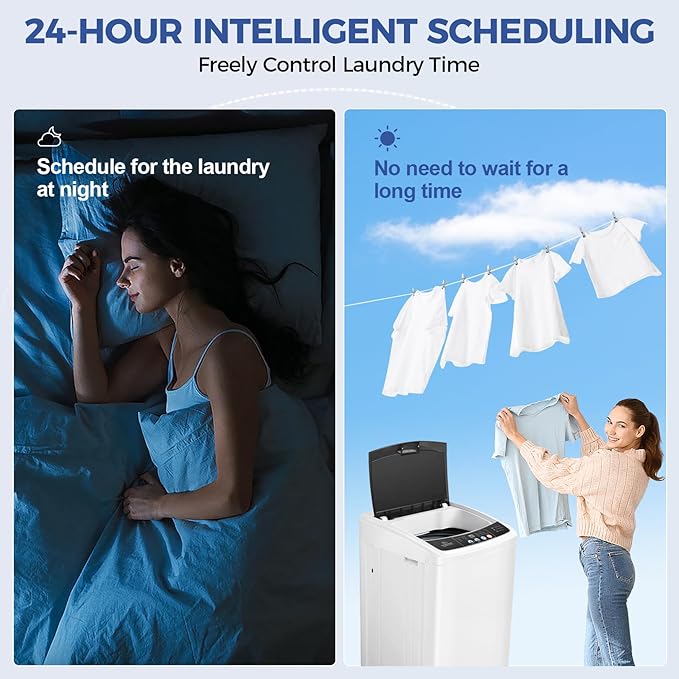 - 【Extremely Energy Saving】---With different levels of water control: L/16L M/23L H/30L. Adjust the different washing mode and water level through the wash push-button. This portable washing machine has a 24 hour smart delay cleaning function. You can preset the washing start time according to your needs. Equiped with high quality and durable motor, providing stable power. Saving as much 84% energy consumption comparing to similar model. Washing machine is able to save money for your household.
