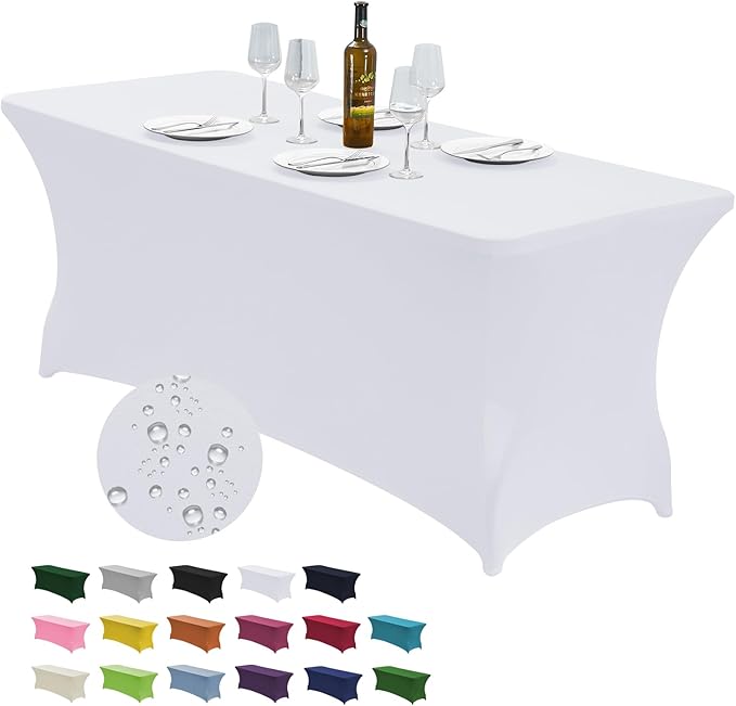 CWK 6FT Waterproof Stretch Spandex Table Cover for Rectangular Tables - Elastic Fitted Tablecloth for Folding Tables,Wrinkle Resistant Table Cloth for Parties, Weddings, Banquets & Events (White)