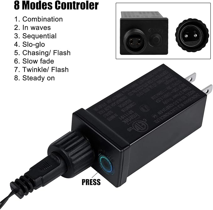 - 8 fantastic flashing modes: Press the press button on ac adapter repeatedly to select 1. combination, 2. in waves, 3. sequential, 4. slow glow, 5. chasing or flash, 6. slow fade, 7 .twinkle or flash or 8. steady on working mode