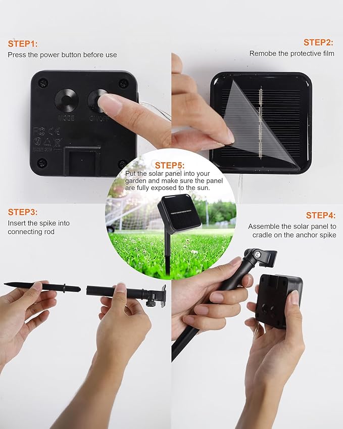 - Solar Powered Lights: Powered by solar, charged in full and direct sunlight for 8-12 hours and suffices for 10 to 14 hours (Note: charging and working time will change depending on the weather), the lights automatically turn the light on at dusk and off at dawn. Each light includes NI-MH AA 800mAh rechargeable battery, the battery has sufficient capacity for bright all night. NOTE: There is a ON/OFF switch button at the back of solar panel, please switch it ON before charging