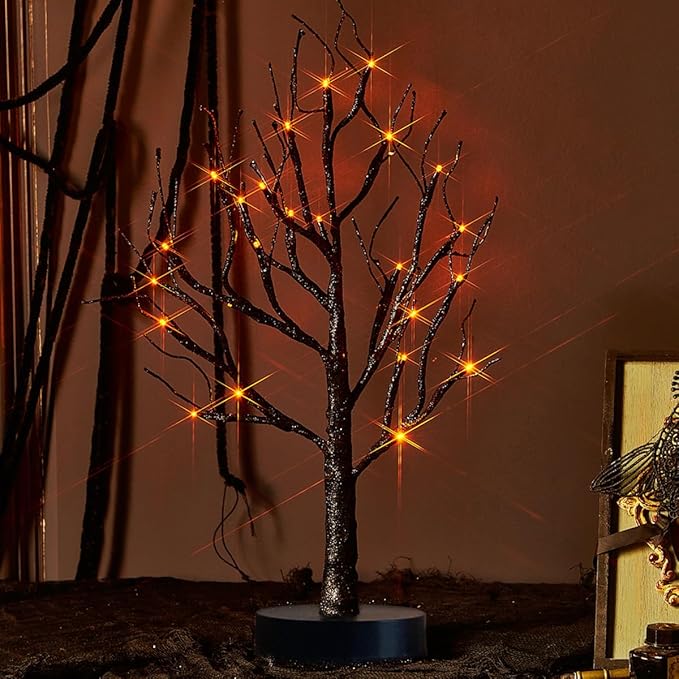 - 🎃【Halloween black tree lights】 2023 new designed table tree lights,black glittered with orange LED bulbs,best for Halloween party decoration.
