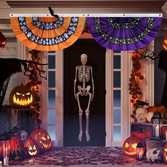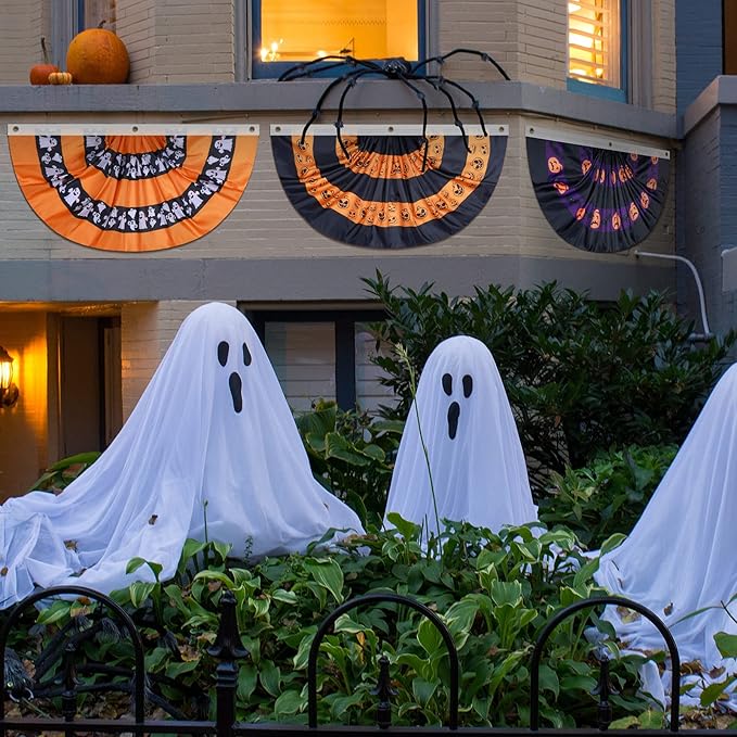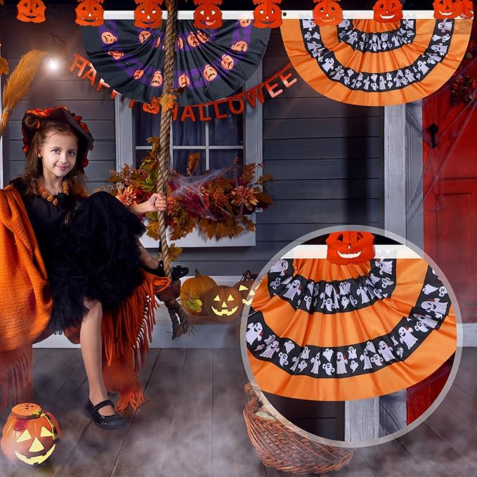 4 Pcs Halloween Bunting Flags for Outside 3 x 1.5 ft Pleated Half Fan Flag Hanging Banner Outdoor with 3 Grommet for Halloween Porch Garden Yard Holiday Indoor Home Decorations, Black Orange