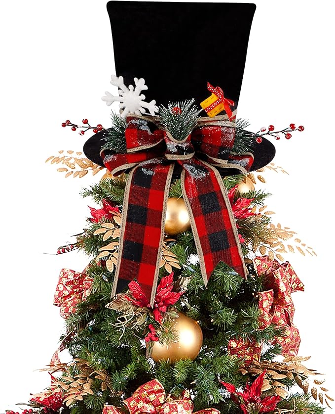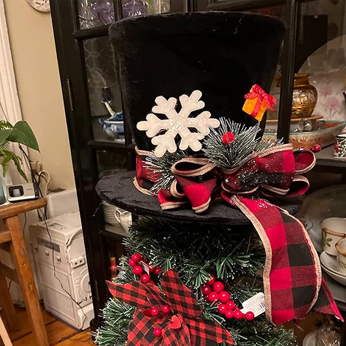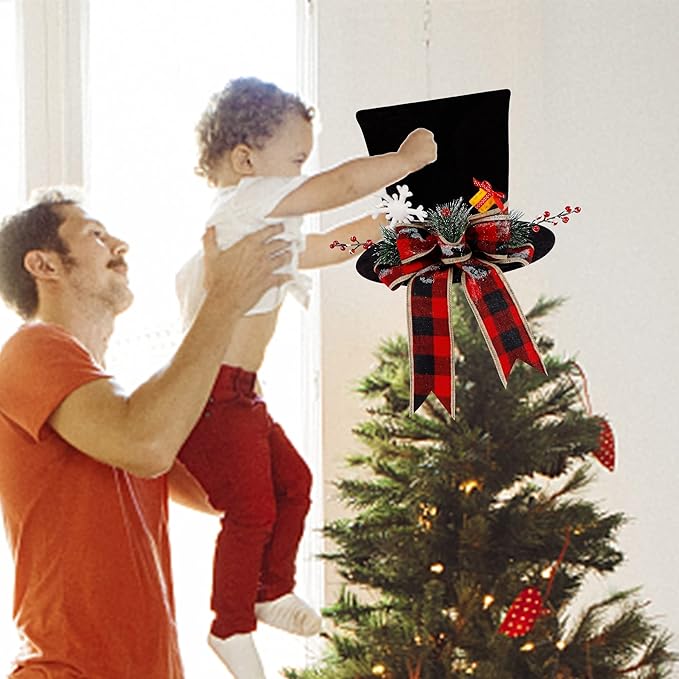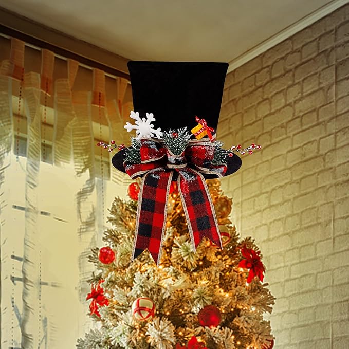- ๐ฉ Christmas Tree Topper: Our velvet black top hat is a perfect partner for Christmas tree to add a nice touch to your Xmas decor. Designed with a buffalo plaid bow, the treetop hat will make your tree look more attractive.