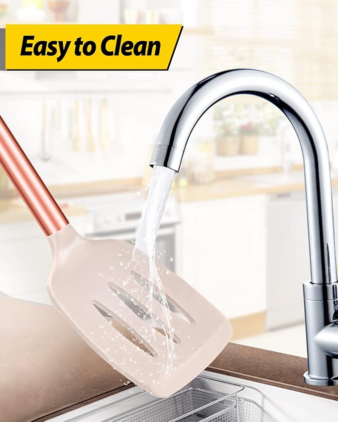 Pack of 2 Silicone Solid Turner, Non Stick Slotted Kitchen Spatulas, High Heat Resistant BPA Free Cooking Utensils, Ideal Cookware for Fish, Eggs, Pancakes(Rose Gold Khaki)