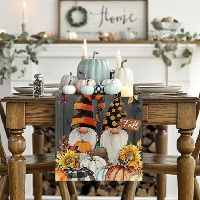 Artoid Mode Fall Gnomes Pumpkins Sunflower Maple Leaves Thanksgiving Table Runner, Seasonal Harvest Vintage Kitchen Dining Table Decoration for Indoor Outdoor Home Party Decor 13 x 72 Inch