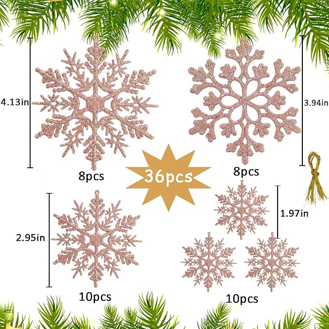 - SNOWFLAKES OF VARIED SIZES: A value pack of 36pcs rose gold Christmas glitter snowflakes in 3 varied sizes and 2 different patterns: 8pcs for 4.2 inch for both styles, 10pcs for 3 inch and 10pcs for 1.8 inch. It’s a lot of snowflakes sufficient for your Christmas decorations