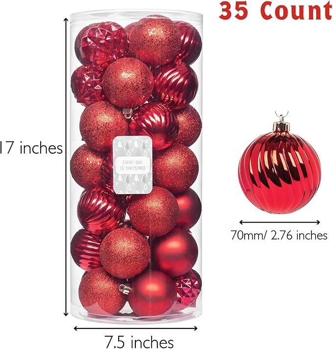 Every Day is Christmas Ornaments, Shatterproof Christmas Tree Ornament Set, Christmas Balls Decoration 35 Count (2.75"/70mm, New Red)