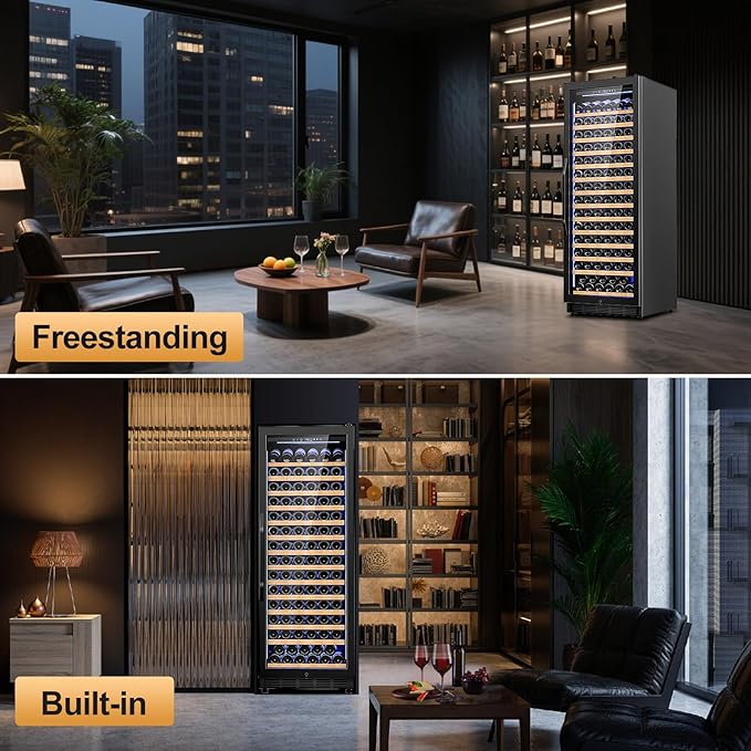 - 179-Bottle Large Capacity Storage:Our 24-inch wine chiller offers extraordinary space for your collection, accommodating 179 standard Bordeaux bottles. The removable wooden shelves with smooth side rails keep bottles organized and easily accessible, while the top display shelf with bottle holders elegantly showcases your finest vintages