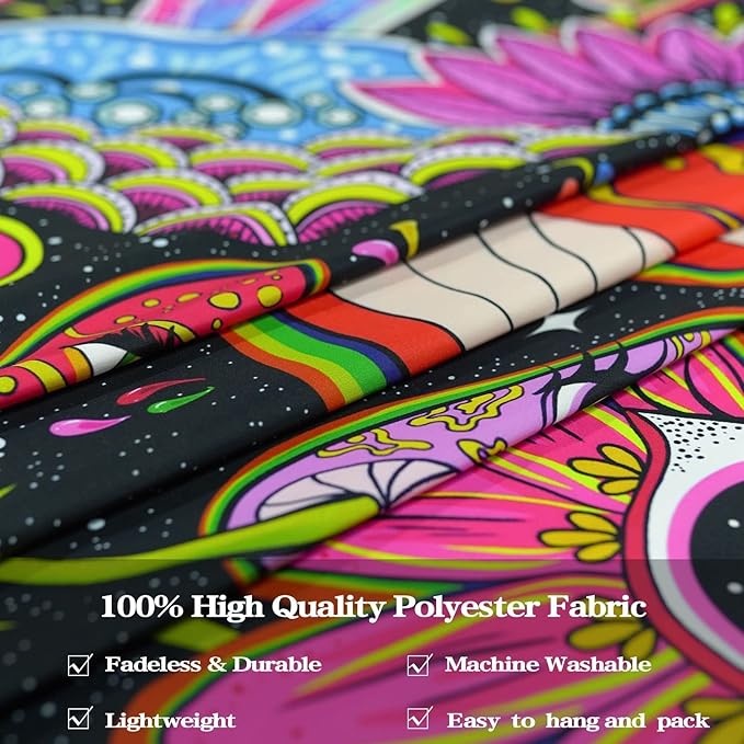 - Vibrant Pink Mushroom Design: This tapestry showcases a bold and colorful psychedelic scene with pink mushrooms and vibrant floral elements, creating a lively, artistic statement. Perfect for adding a splash of color and creativity to your bedroom, living room, or any space in need of energy.