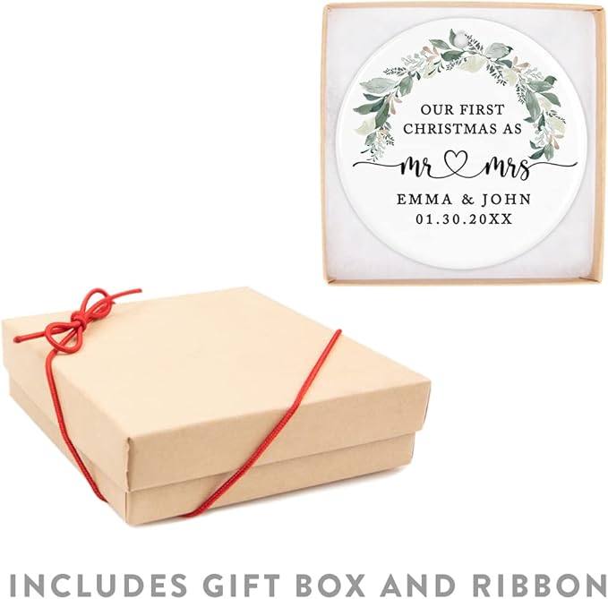 - Gift-Ready with Elegant Packaging: Whether it’s for you or as a thoughtful gift for newlywed friends or family, this custom christmas ornament comes beautifully packaged and ready for gift-giving. The included ribbon makes it easy to hang, adding a touch of elegance to any tree. It's ideal for wedding ornaments for bride and groom 2024.