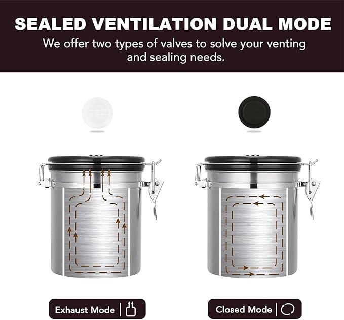 - 【TWO EXHAUST MODES】The canister features a CO₂ valve system and a silicone seal to lock in freshness and keep out moisture and air. A silicone gasket around the edge of the lid ensures an airtight seal when the lid is closed. Storing your coffee beans in this well-designed canister helps extend their freshness and ensures that every cup, even weeks later, tastes as good as the first.