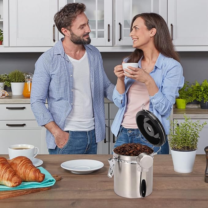 - 【STAINLESS STEEL COFFEE CONTAINER】Made from high-quality 304 stainless steel, the opaque body creates an ideal environment for storing coffee beans. The canister blocks out light and moisture to protect your ingredients—whether they’re coffee beans, dried nuts, or other pantry staples.Its robust construction offers long-lasting durability.