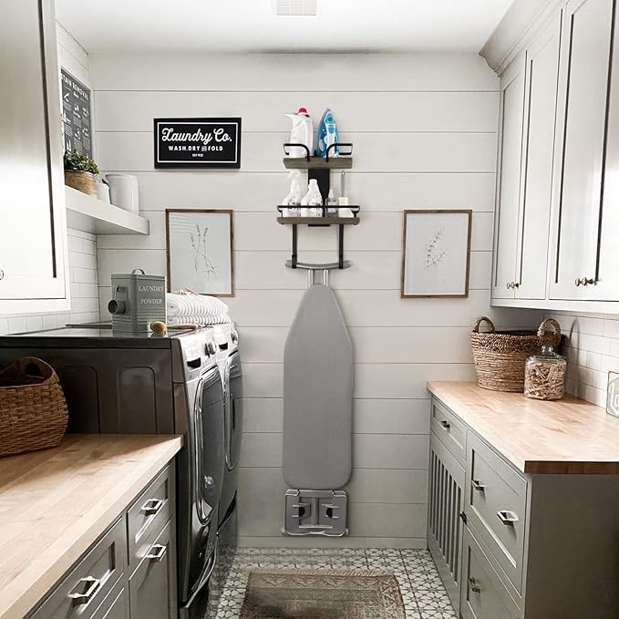 - 【Laundry Room Must-have】Seamless construction of natural rustic wood and metal is both aesthetically pleasing and durable, serving as a safe haven for your ironing board and irons. There is no more complaint about ironing board spoiling your house’ s decoration.
