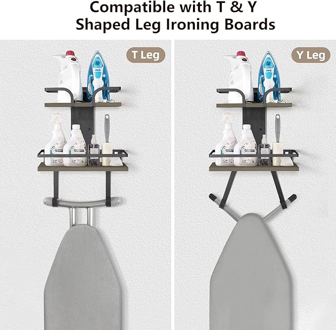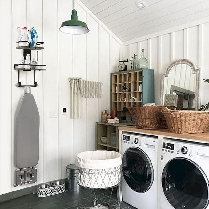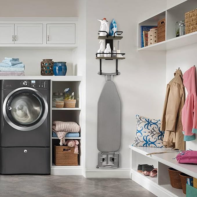 - 【Functional & Versatile】 Apart from the ironing board and the iron, you can store various types of items on the shelves. This holder is also suitable for utility room, sewing room, bathroom, kitchen, or bedroom to keep everyday stuff organized and accessible.