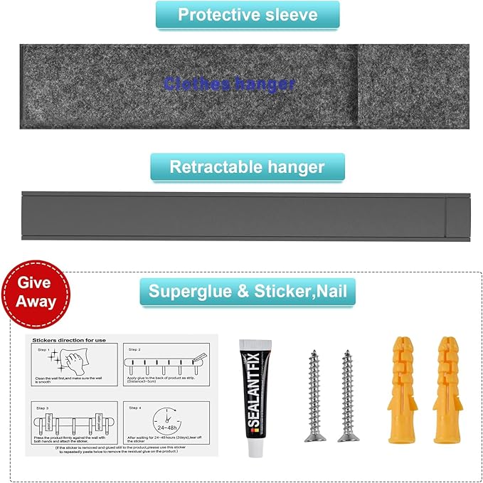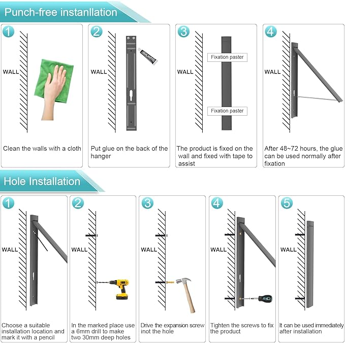 - EASY INSTALLATION:We provide you with two installation methods, if you install the drying rack on the door, glass, tile wall and other smooth walls, you do not need to punch, we provide you with nail free glue. If you want to mount a folding hanger on a lime wall, we provide you with two screws.