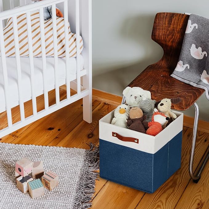 - 【Sturdy Leather Handles】Sturdy thickened leather handles and metal iron buckles make 13 inch cube storage bins easy to carry even with a heavy load. Cardboard is inserted at the bottom and sides to provide support, so that these decorative storage boxes for organizing to stand on, holding the shape well and can be used for a long time