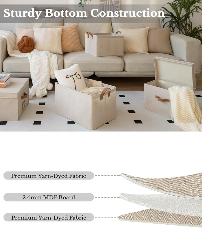 - Premium Quality: Made from high-quality fabric and reinforced with a heavy-duty MDF bottom board and a sturdy metal frame. The solid construction enables the storage bins to stand upright without support, even when empty.