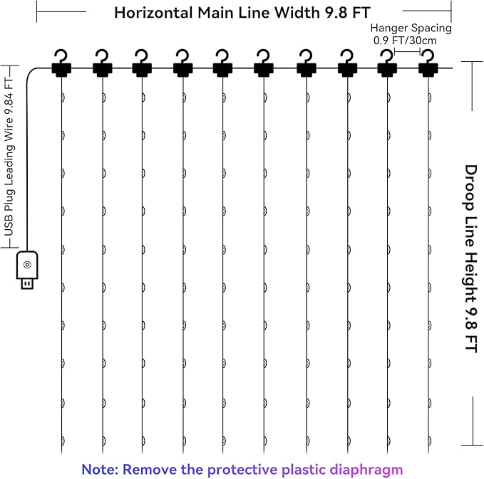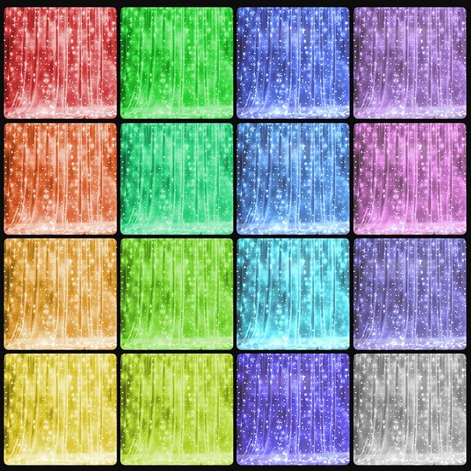 - Color Changing Design: Our 9.8 ft x 9.8 ft curtain lights with 300 LED, the lead wire length 8.2 ft, the spacing between each bulb is 3.9 inch. The mini string lights has the latest color changing design with 16 different colors and 4 lighting modes to meet your different color needs. With 10 pothooks, you can easily hang this fairy string lights on your wall or in your home.