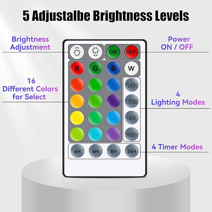 - Functional Remote Control: With this 28 key RGB handy remote, you can choose 16 different colors, 4 light flashing modes like fade, jump, flash, chase. Press "DIM-" and "DIM+" can adjust 4 levels modes of brightness. You can set up the timer: "4H" (4 hours on/20 hours off), "6H" (6 hours on/18 hours off), "8H" (8 hours on/16 hours off), "24H"(always on)