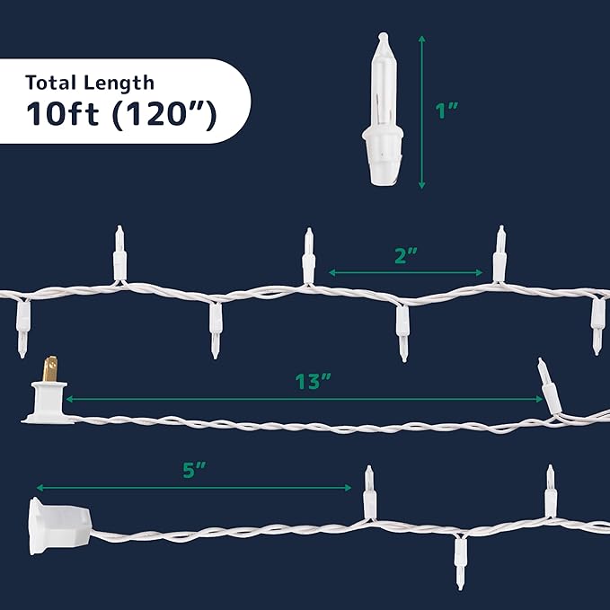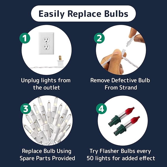 - Complete Light Set: Includes 50 christmas lights indoor bulbs on 10 ft of white wire, 2 flasher bulbs for twinkle effect, plus extra bulbs and replacement fuses for easy setup and maintenance