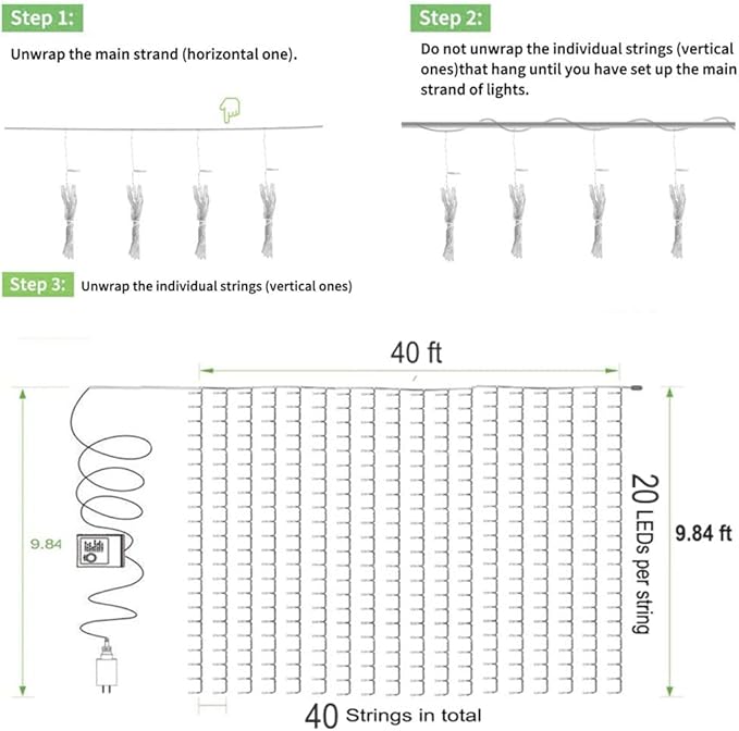 - [40 ft x 10 ft Curtain Lights] Boasting 800 LED lights, 4-5 times wider than others, making it ideal for outdoor decor. The product has an IP44 weatherproof rating, but please ensure you protect the plug and controller, as they are not waterproof. (please Note: they are NOT connectable)