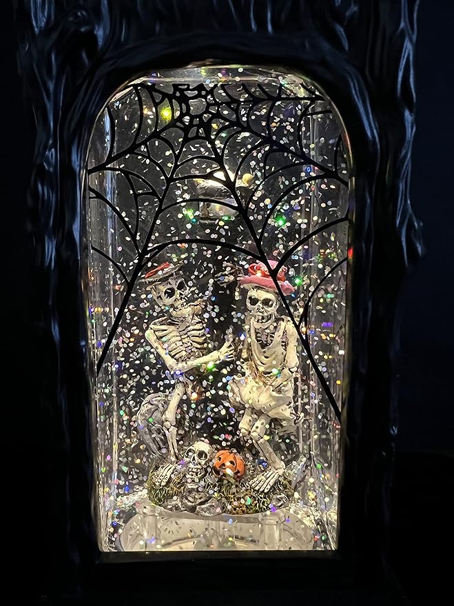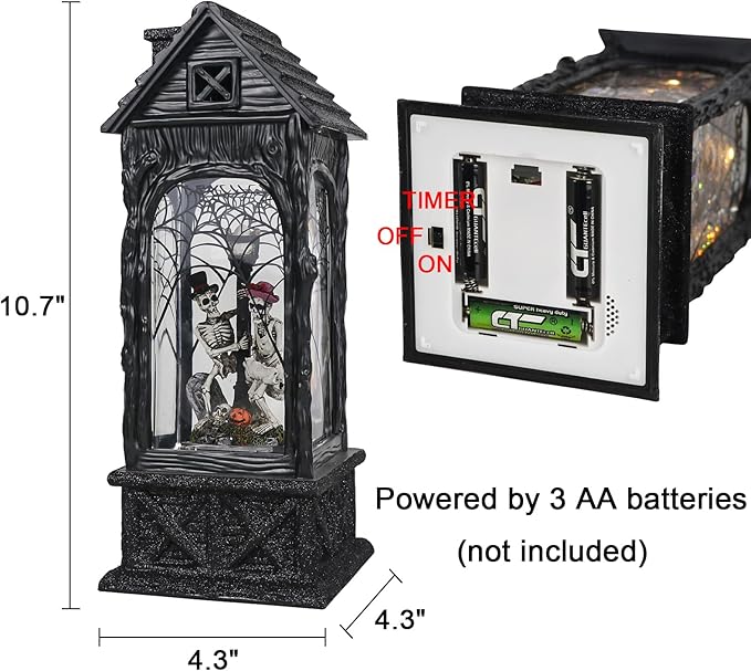 - PACKAGE LIST: You will get one skeleton water snow globe lantern with timer, one user manual, one USB to DC cable Product dimension is 4.3”x4.3”x11”. Included USB cable allows you operate the snow globe lantern without batteries. You can also operate it with 3 AA batteries(not included)