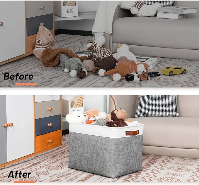 - ๐ใSturdy & Resistantใ--- Set of 3 , dimensions(each): 16(L) x 12(W) x 12(H) inches. Premium Materials, resistant and has no odor. The leather handles and metal iron buckles are sturdy.The sturdy handles make fabric storage baskets easy to carry or pull off and out of shelves.