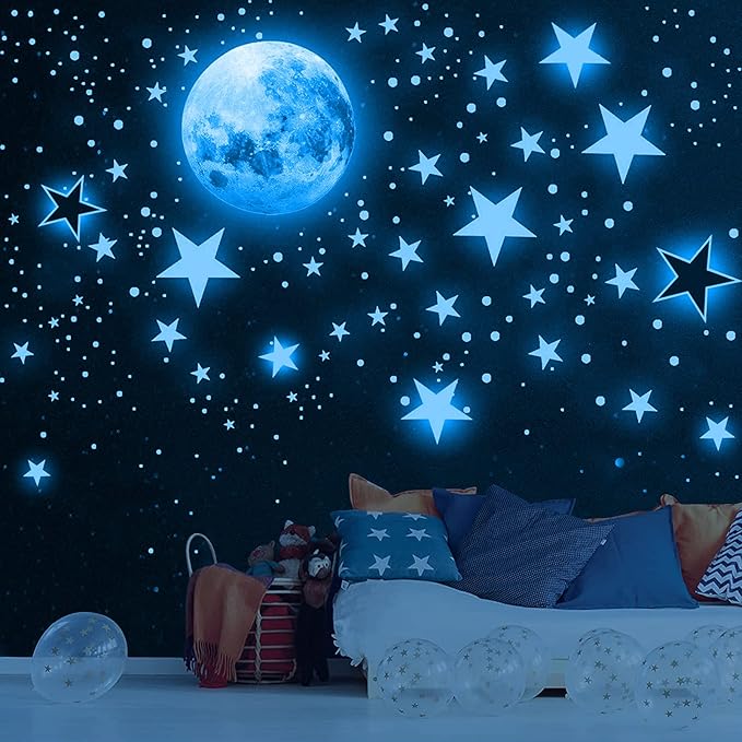 - 🌍【1049 PCS Glow Stars Wall Stickers】You will get 1049 PCS in one set, including 1 piece moon and different sizes of stars and dots. Super bright noctilucent stars transform your child's room into a realistic starry sky. And soothe your child to sleep.
