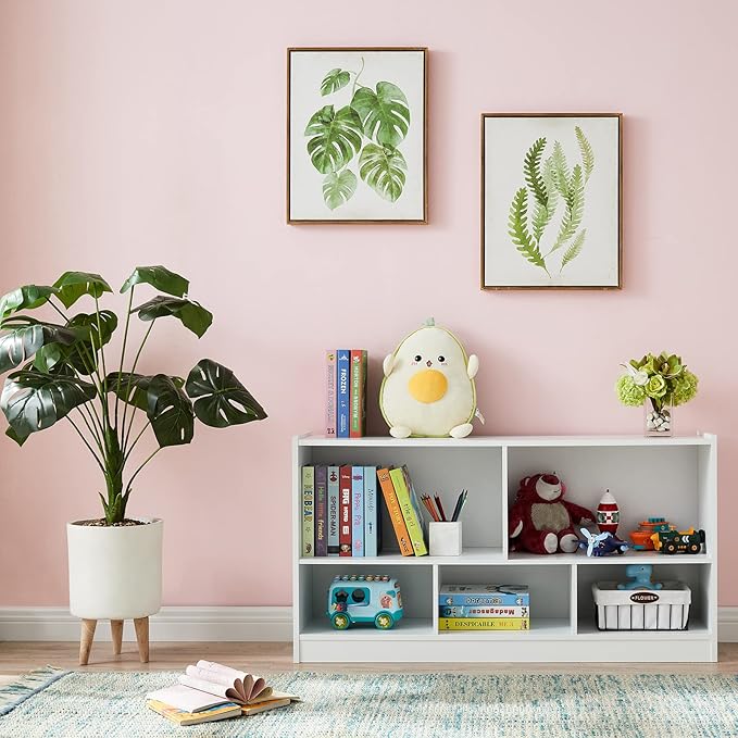 - 【Perfect Toy Storage Cabinet and Bookshelf】: With five compartment cabinets, this toy organizer can easily store and display a variety of items, such as books, toys, art supplies and more, making the children's messy rooms neat and orderly rather than having a bunch of toy all over. In addition, you can add fabric or woven boxes to create interesting hidden storage to reduce the visual clutter.