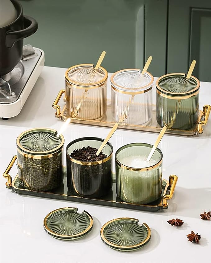 - ▲▲【Material】: Transparent thickened acrylic condiment container, made of PP plastic, equipped with 3 metal spoons and a practical tray with a handle, sturdy and corrosion-resistant, it can be effectively stored while decorating home life, adding color.
