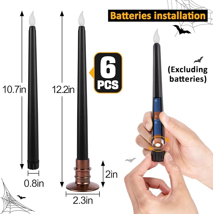 - [Creating a Halloween Atmosphere]: This flickering tapered candle is 10.7 inches tall. When placed on the base, it is 12.2 inches high in total. They're perfect for your home's fireplace, dining table, and windowsill. You can also put these candles with pumpkin lanterns and skull decorations to create a spookier atmosphere for Halloween.
