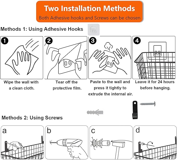 - ๐ใSturdy wire baskets that can hold 40 poundsใ These baskets are made of durable steel wire with durable anti-rust and anti-corrosion coating, as well as wall-mounted hardware and hooks, which can hold 40 pounds. (Note: If you use non-marking paste instead of screws, the basket can hold 10 pounds)