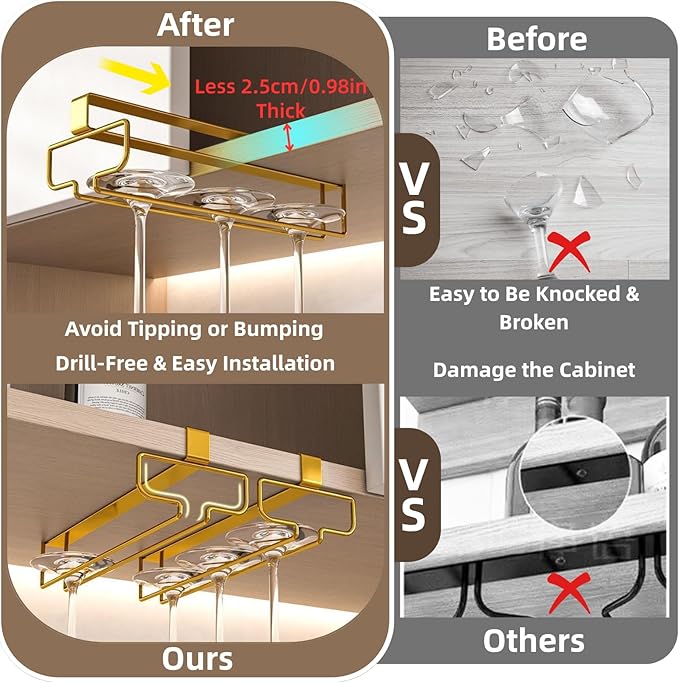 - Drill-Free & Easy to Install: No drilling is required. This wine glass rack can securely hold your wine glasses without worrying about accidental slippage or falling. The smooth black finish prevents any scratching or chipping on the surface of the wine glasses. It's very easy to clean and not easily stained.