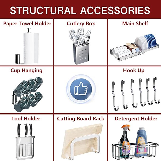 - All STAINLESS STEEL MATERIAL: made of 304 stainless steel, totally strong and sturdy, enoughthis over the sink dish rack is durable enough for long term use. Besides, its large capacity allows you to store all the tableware, while the over-the-sink design enables it to drain water directly into the sink, not onto the countertop, effectively avoiding water pooling. (Some Accessories Have a Protective Film On the Surface, Please Tear It Off Before Use.)