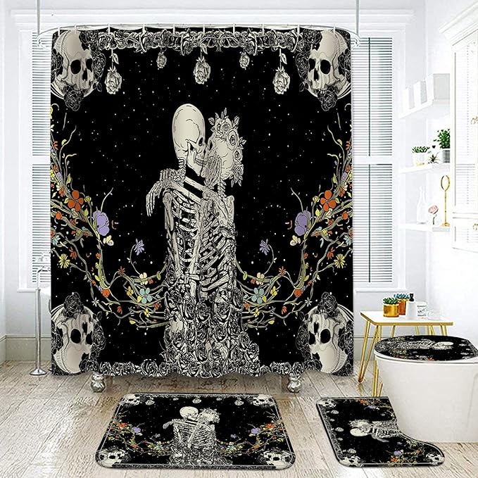 - 🛀【Halloween Bathroom Accessory Set/ Sets】Halloween skull couple with flower shower curtains sets included :1 PC fabric waterproof shower curtain; 1PC Rectangle Bath rugs; 1 PC U-shaped Contour Mats; 1 PC Toilet Lid Cover; 12 PCS/C-shaped White Plastic Hooks. No liner is needed