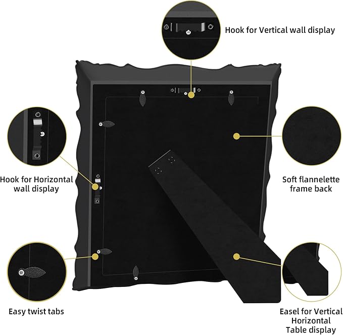 - Easy to Display: This 8x10 black ornate frame comes with a removable white mat and a decor picture. The white mat can be entirely removed for 8x10 paintings or keep it for 5x7 paintings, perfect to display any photos or paintings. The back of frame is a soft velvet back plate equipped with a easel and two-way serrated hook, which can be displayed on tabletop or hang on the wall in vertically or horizontally.