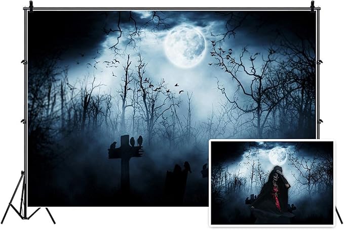 AOFOTO 15x10ft Moon Night Halloween Cemetery Photography Backdrop Flying Bats Birds Stand on Gravestone Cross Graveyard in Dark Forest Photo Background Cloth Vinyl Wallpaper Photo Studio Props