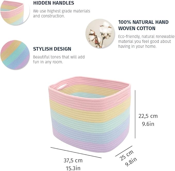 - Premium Cotton Rope Weave – These beautiful rainbow toy baskets are woven with high-quality, all-natural cotton to give them the right balance of softness and durability. This makes them great for bedrooms, nurseries, and laundry rooms as rainbow room decor.