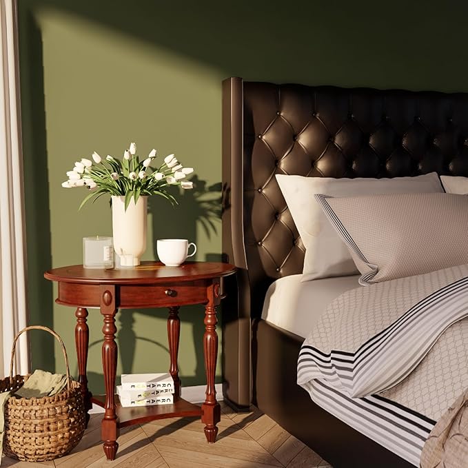 MODERION Solid Wood End Table with Drawer, Oval Sofa Side Table, Storage Shelf, Living Room Corner Table, Nightstand, 24”H Cherry Walnut CJZ1533WD-DR