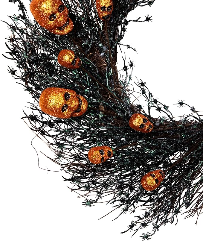 Glittered Skulls and Spiders Halloween Twig Wreath - 22" - Unlit