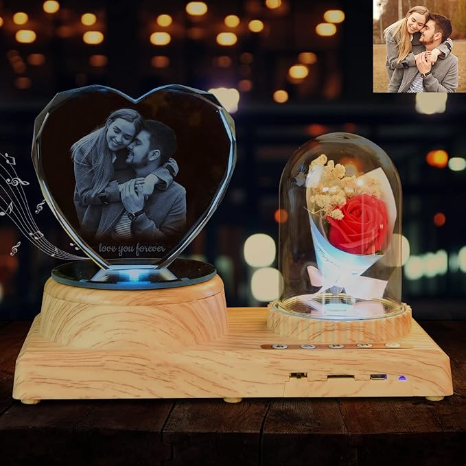 Heart-Shaped Photo Customization Night Light Personalized 3D Crystal Lamp 7 Color Light Rose Bluetooth Rotation Crystal Photo Frame Best Gift for Couple Love Women Men Wedding Christmas