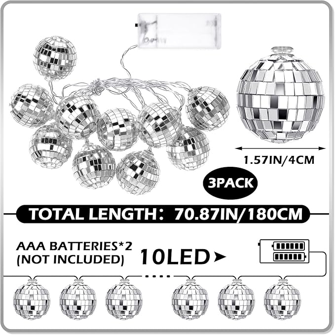 - Package Content: you will receive 3 strands of disco ball string lights, each strand has 10 colored LED lights; These mirrored disco balls are necessary for your Christmas party, bring you much happiness