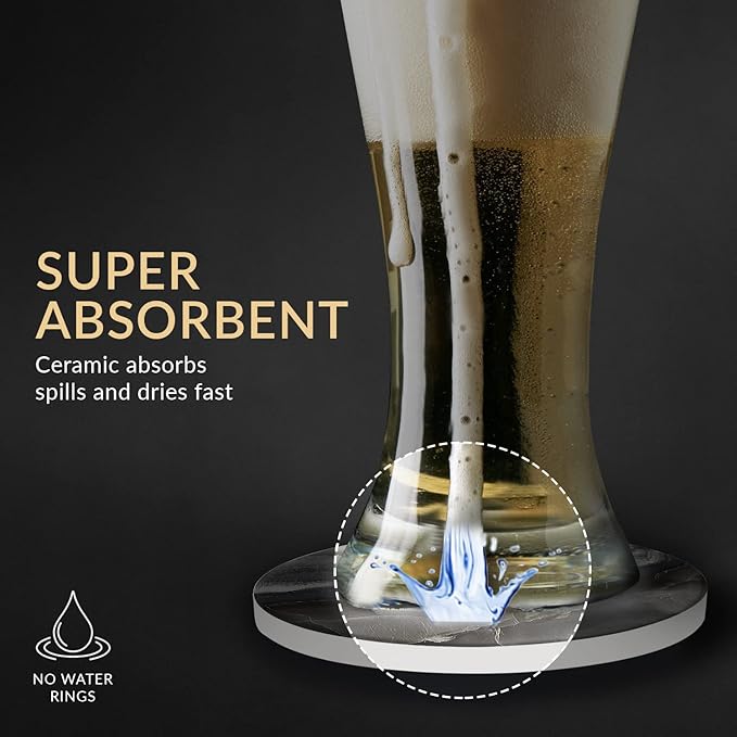 Emerson Coasters for Drinks Absorbent – Saucers Coffee Table Set of 6 with Holder, 100% Ceramic Wooden Tabletop Protection Marble Style, Non-Slip & Cork Bottom - Heavy Duty Drink Coasters (Crown)